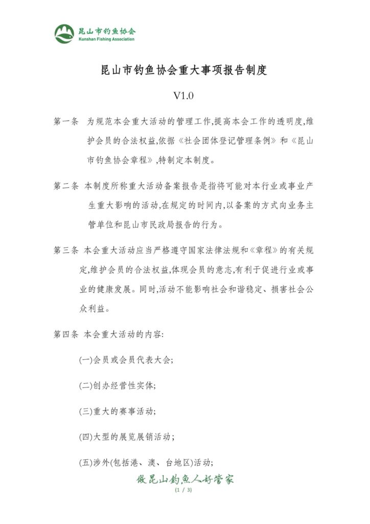 昆山市钓鱼协会正式实施V1.0版重大事项报告制度,明确要求会员大会、经费管理、赛事活动及大型发展活动等关键事务须及时上报。该制度通过四条核心条款界定适用范围与执行标准,旨在规范协会内部治理流程,强化对重大决策的监督管控。文件严格限定报告内容类型,确保信息透明度与组织运作合规性,为会员活动提供制度化保障框架。— 导读内容 标签:协会制度协会管理重大事项报告钓鱼协会